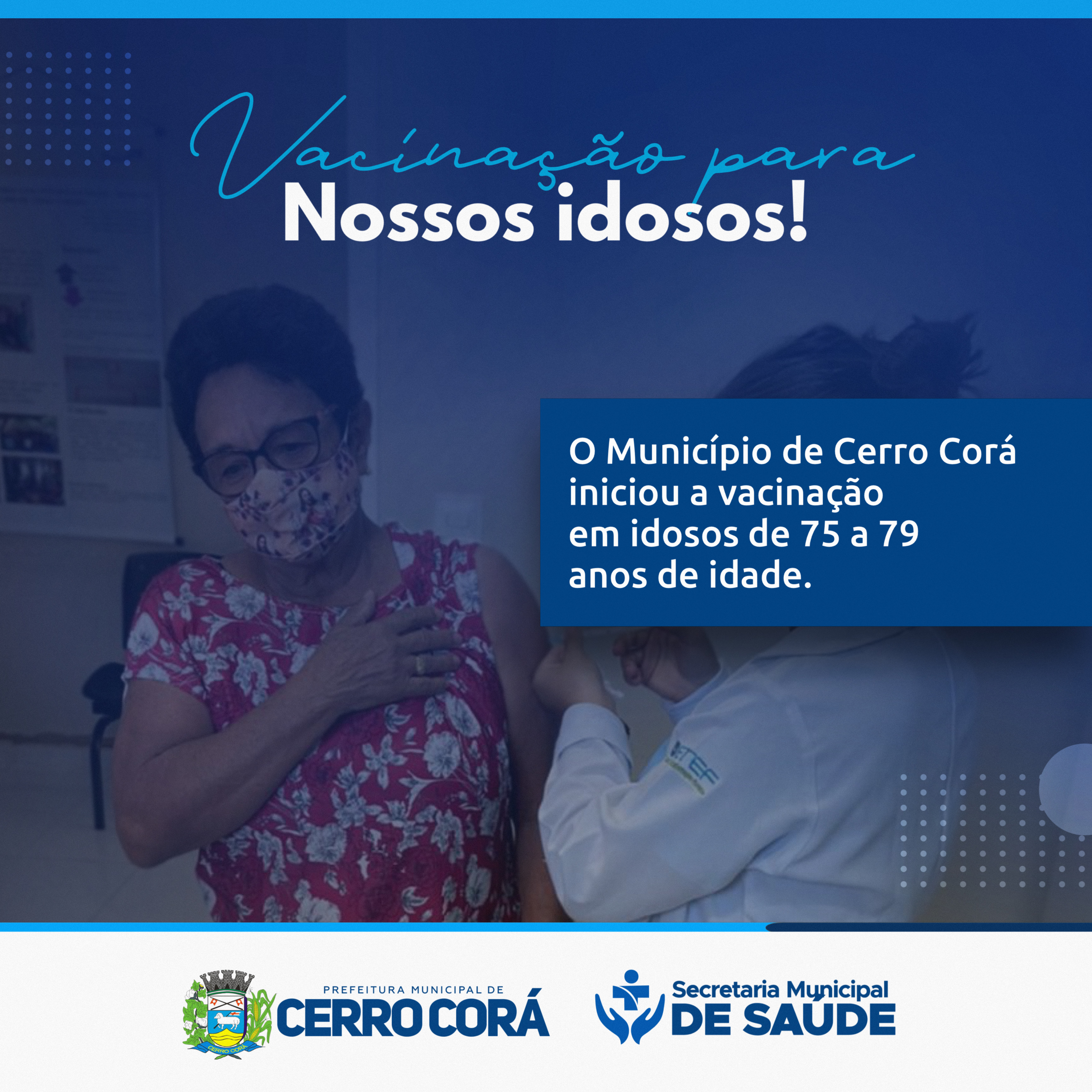 A Secretaria Municipal de Saúde de Cerro Corá/RN, iniciou nesta semana a Vacinação da etapa de Idosos entre 75 a 79 anos de idade.